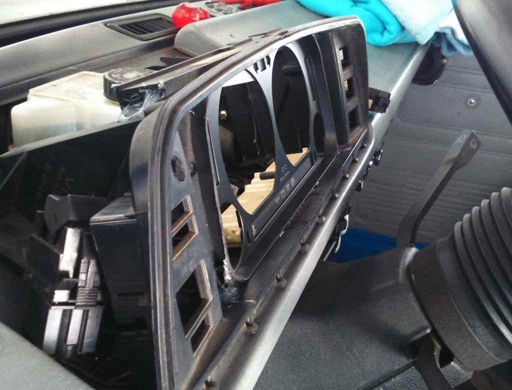 - Die Tachokonsole passt nur sehr knapp an ihren Platz. Zum Einen ist daran der Bremszylinder schuld, denn der ragt ziemlich weit in Richtung Lenkrad, zum anderen sind die Tachoscheiben größer und die beiden Rücksteller für Uhr und Tageskilometer müssen auch noch zu bedienen sein. Es ist etwas Frickelarbeit, das alles genau einzupassen, wie ich finde.